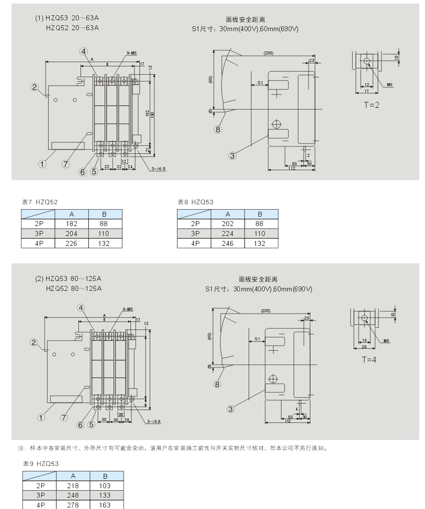 (2)The outlines and sizes of these three different currents---80A/100A/125A are same as that of HZQ53 three-step transfer switches in the same standard.