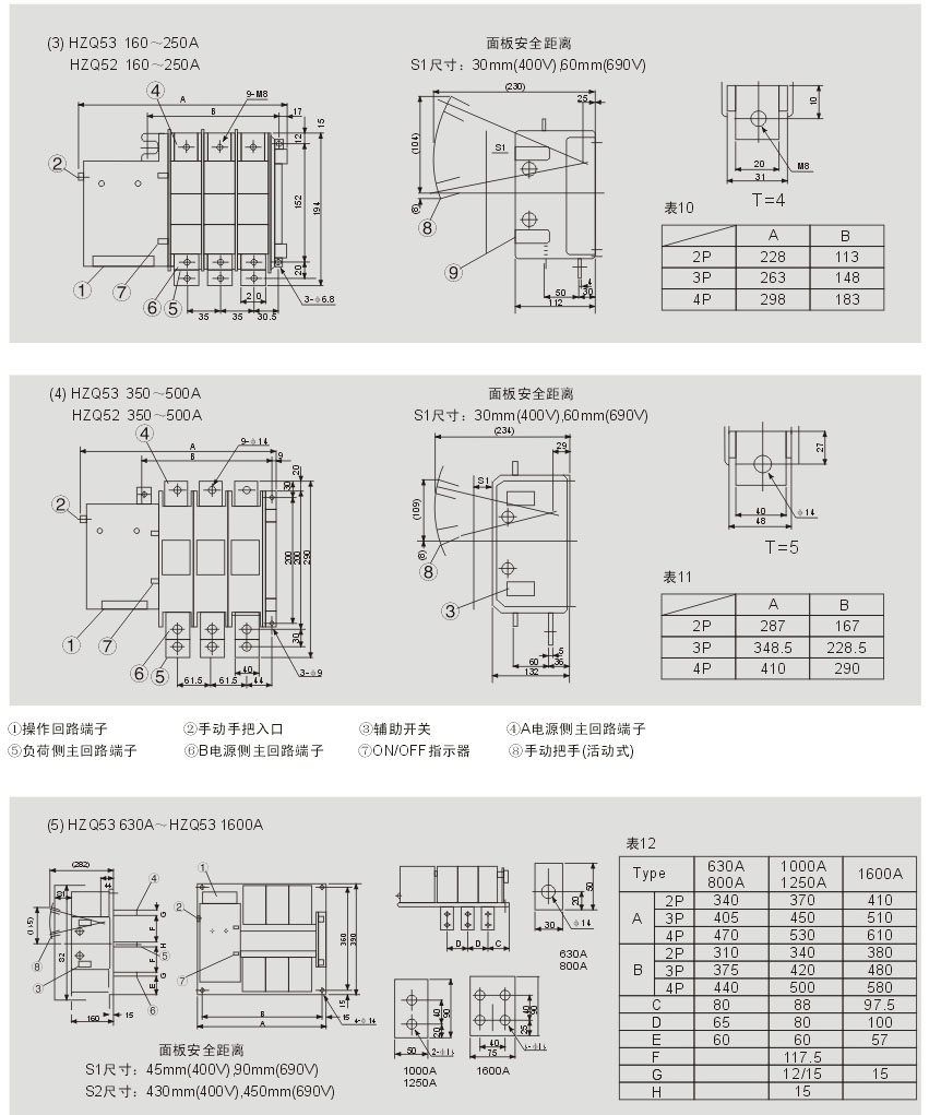 The outlines and sizes of these four different currents---160A/200A/225A /250A are same as that of HZQ53 three-step transfer switches in the same standard.