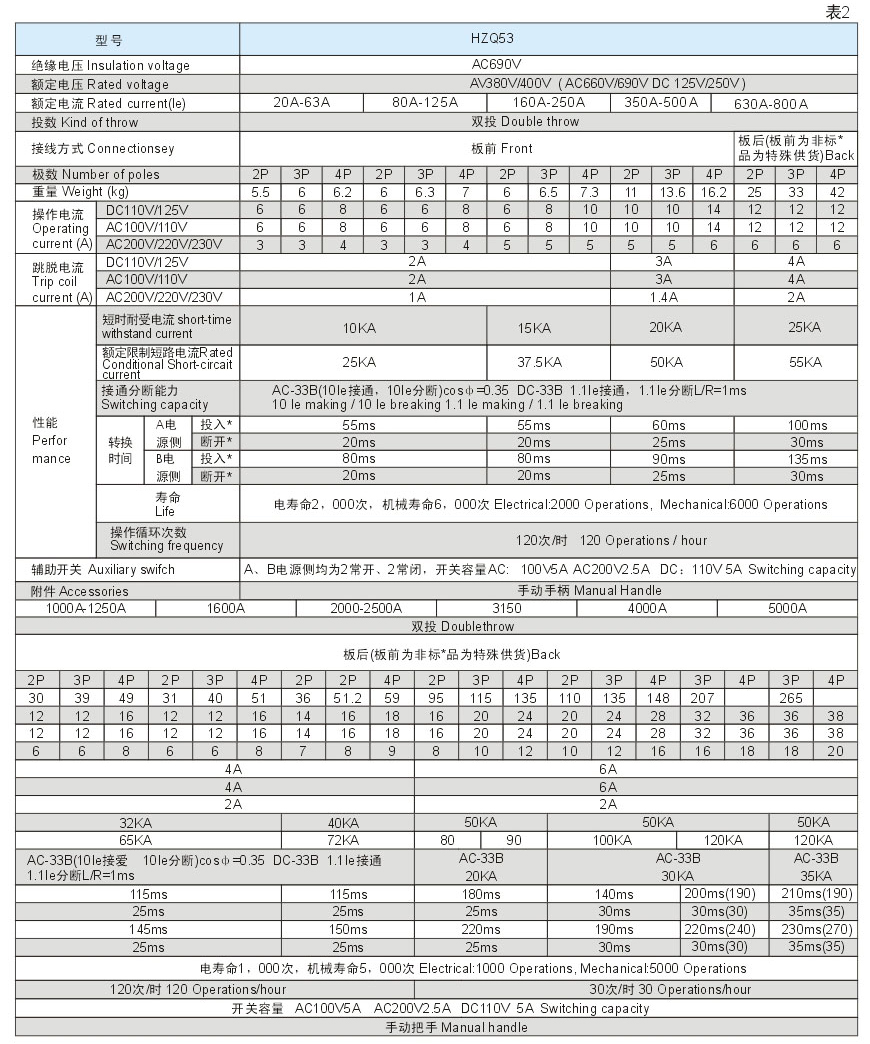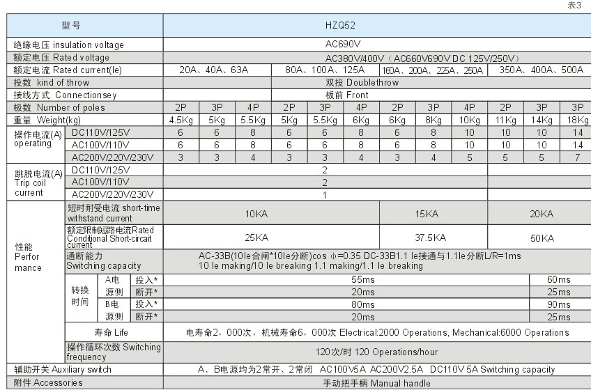 Îå¡¢Parameters of HZQ53 three-step transfer switch.
